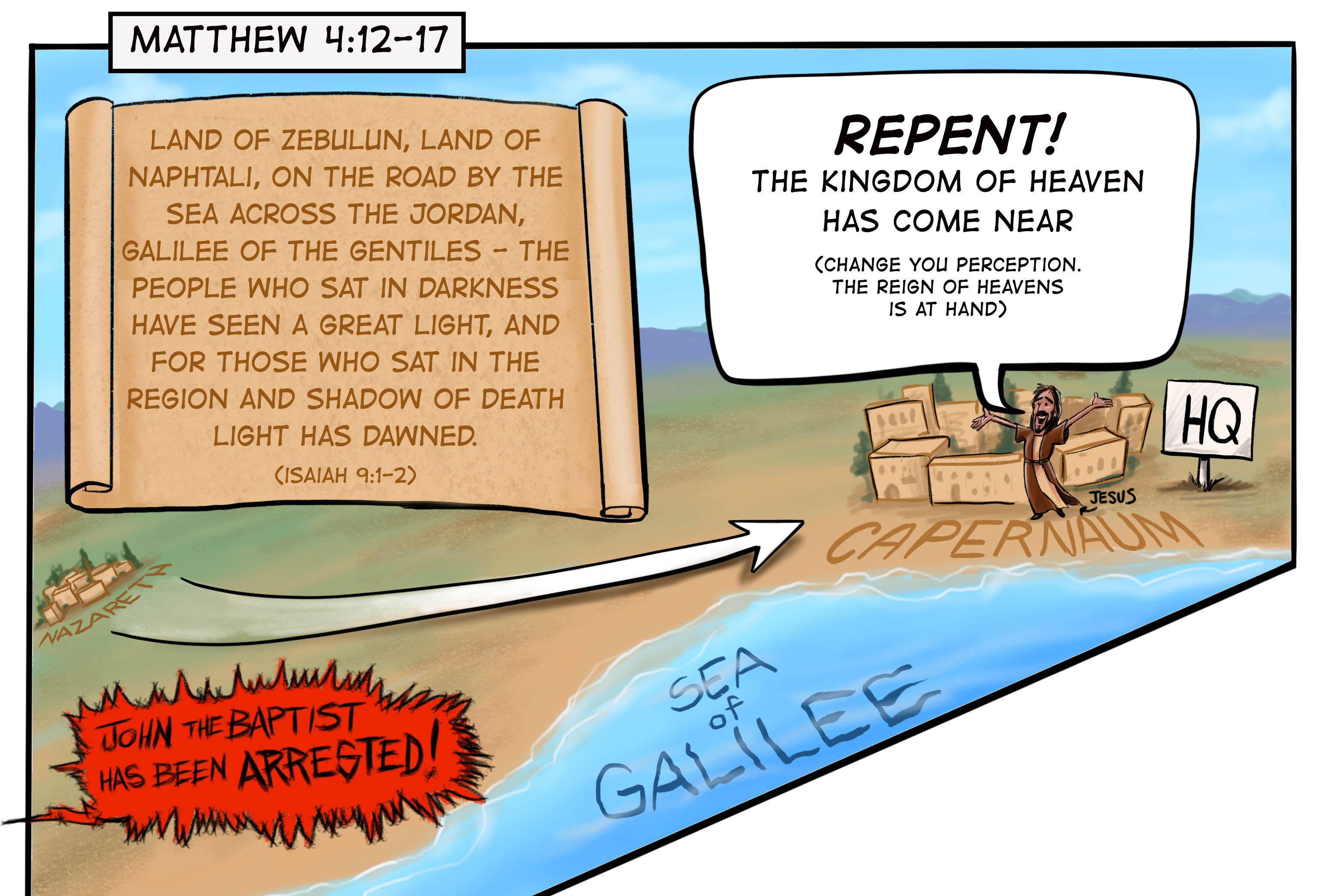 The second story is found in Matthew 4:12-17. Jesus hears that John has been imprisoned. This prompts him to move to the fishing village of Capernaum and start preaching the same message that John preached, “Repent, for the kingdom of heaven has come near.” This, once again, fulfills the words of the Hebrew prophet, Isaiah, and exalts the land of Galilee where Jesus will spend the next three years preaching and healing the people.