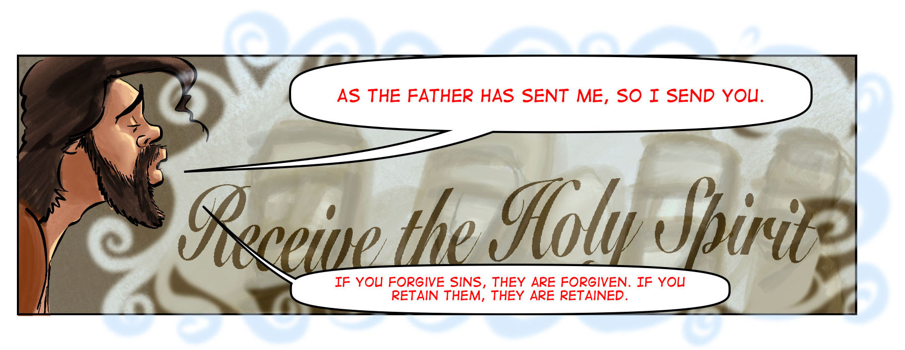 Gospel Reading John 20:19-23. Jesus breathes the Holy Spirit onto the disciples.