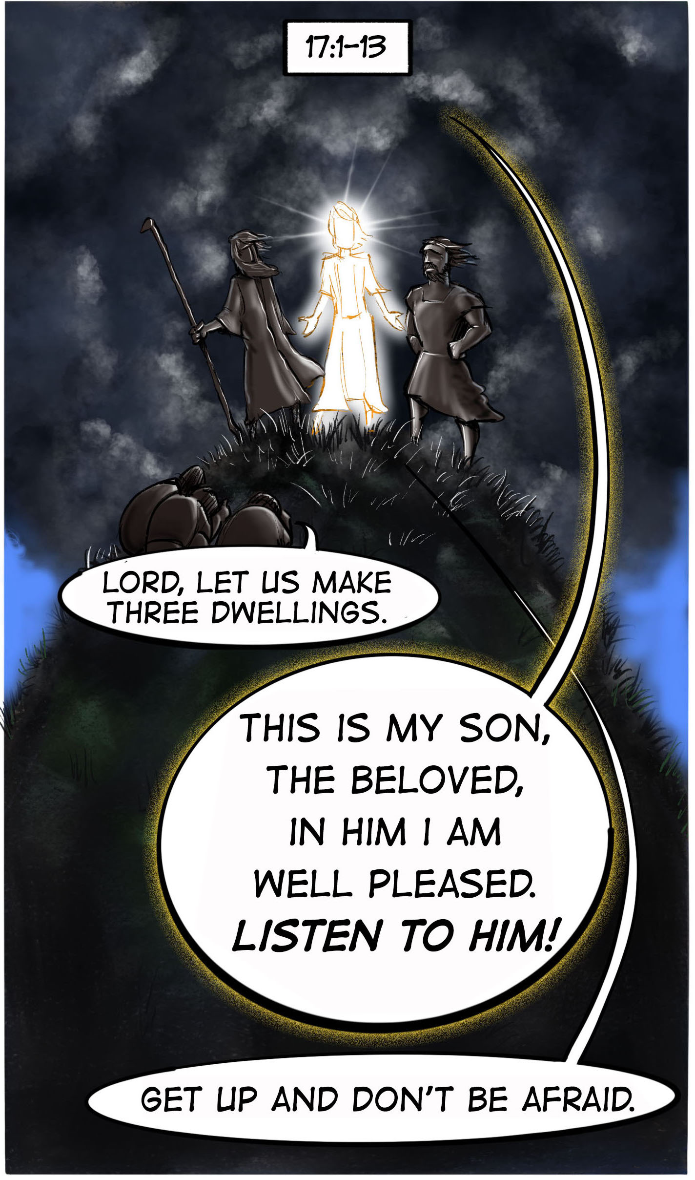 We jump a few chapters in Matthew this week. We move from the Parables Discourse in chapter 13 to the Transfiguration in Chapter 17. Check out the parts we skipped on page 10, and page 11, of A Cartoonist’s Guide to Matthew.