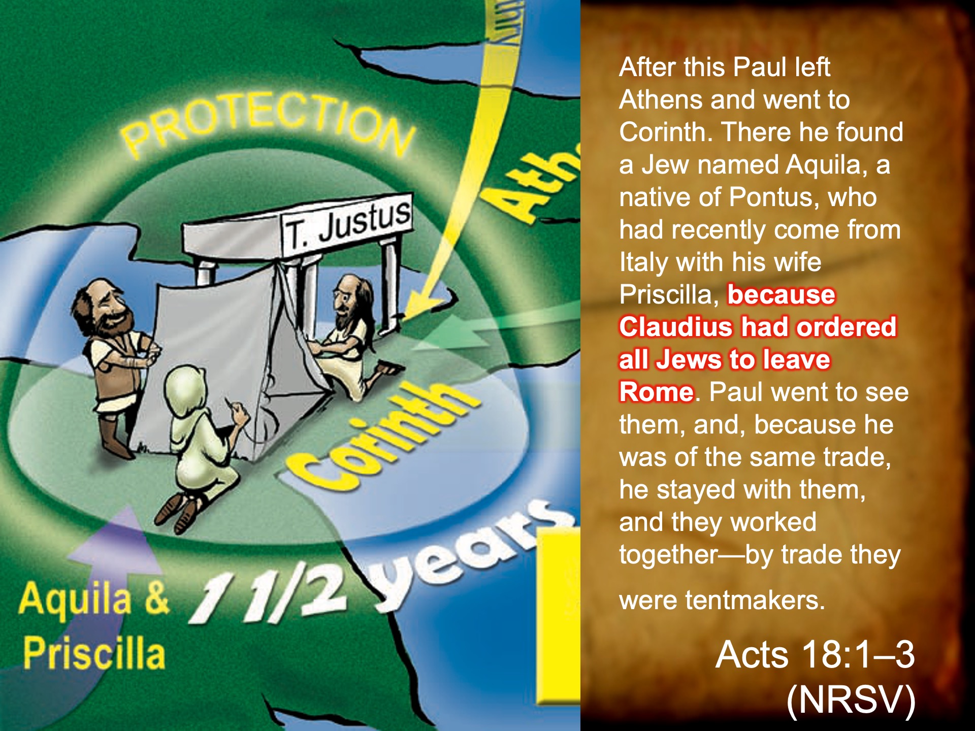 During one of Paul’s journeys–found in the story of Acts–he spends 18 months in the city of Corinth, hanging out with a married couple named Aquila and Priscilla. They are Jewish people who are in Corinth because the Roman Emperor had all the Jews run out of Rome.