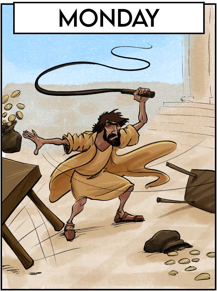 The first thing Jesus does after riding into Jerusalem is he goes to the Temple and drives out the money changers. This may or may not have happened on Monday.