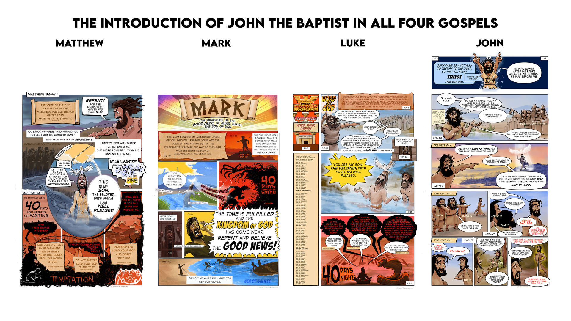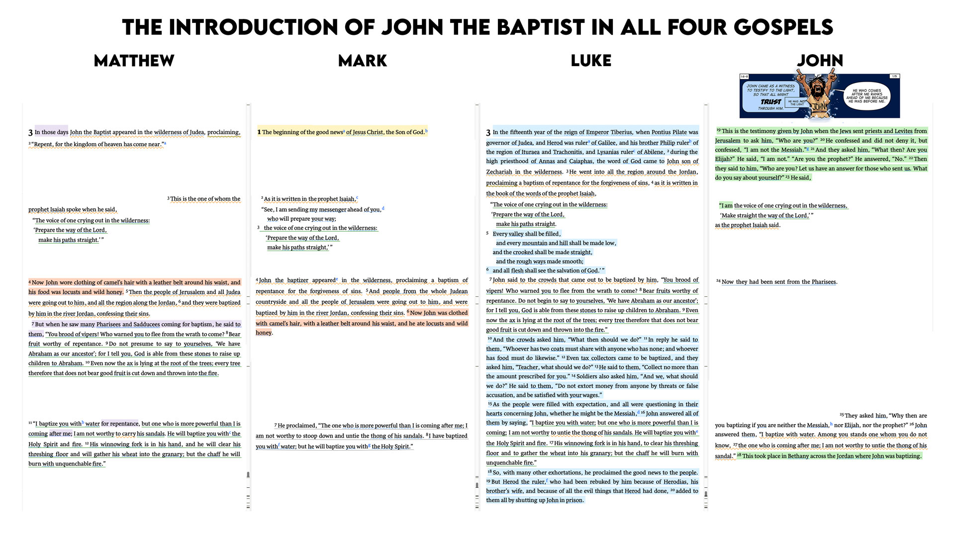 We met John the Baptist in the prologue. It is significant to note that the story of John the Baptist is included in all four Gospels. See the comparative images below.