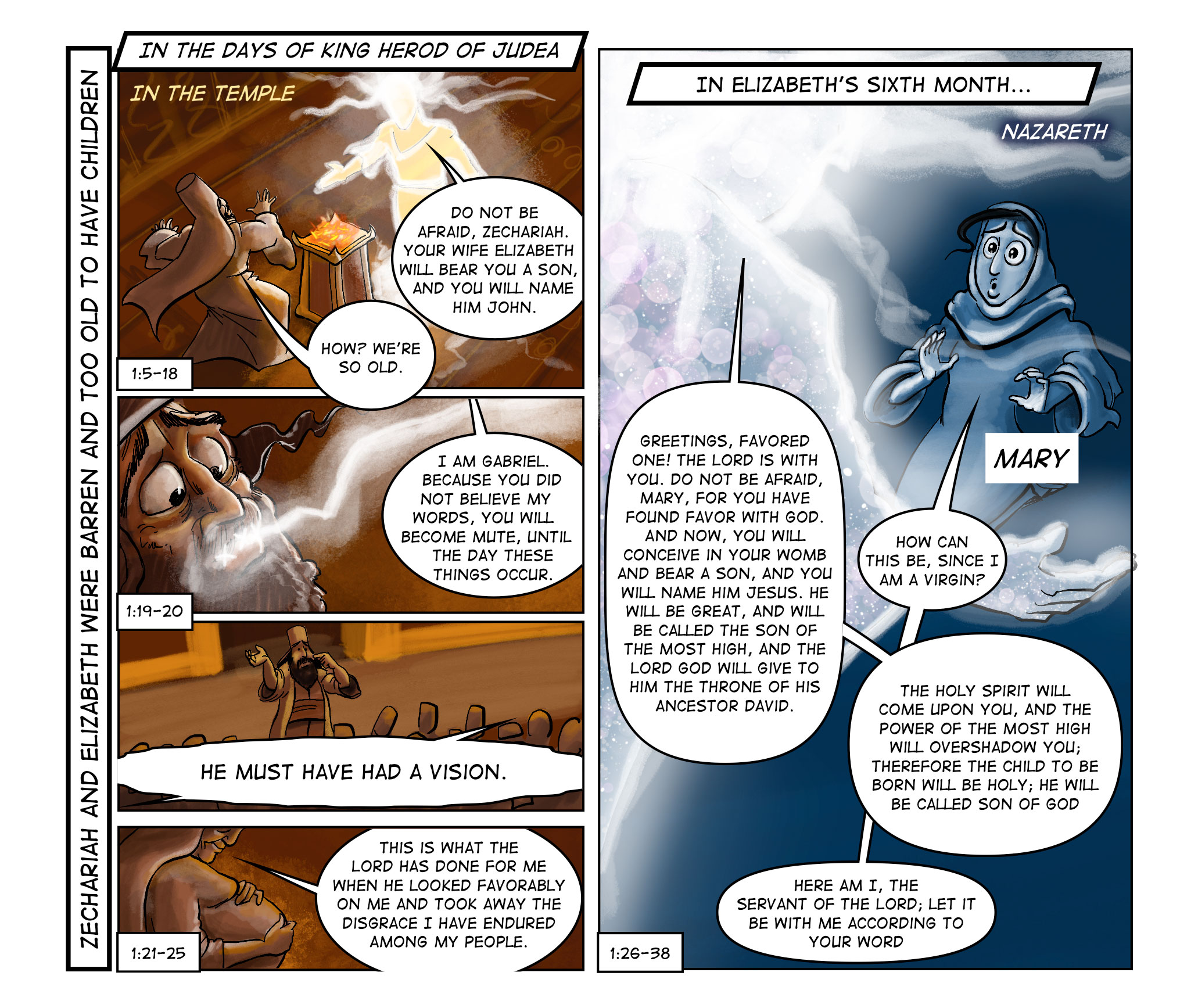 In Luke 1:5-38 we see a contrast between two encounters with the angel Gabriel. First, Gabriel comes to Zechariah, a priest who is serving in the Temple in Jerusalem. Zechariah represents the religious establishment. He is faithfully fulfilling his religious duty, but when he encounters the divine messenger he lacks faith. However, Zechariah is also like the patriarch, Abraham, and is given a promise that his elderly wife, Elizabeth, will conceive and have a child.