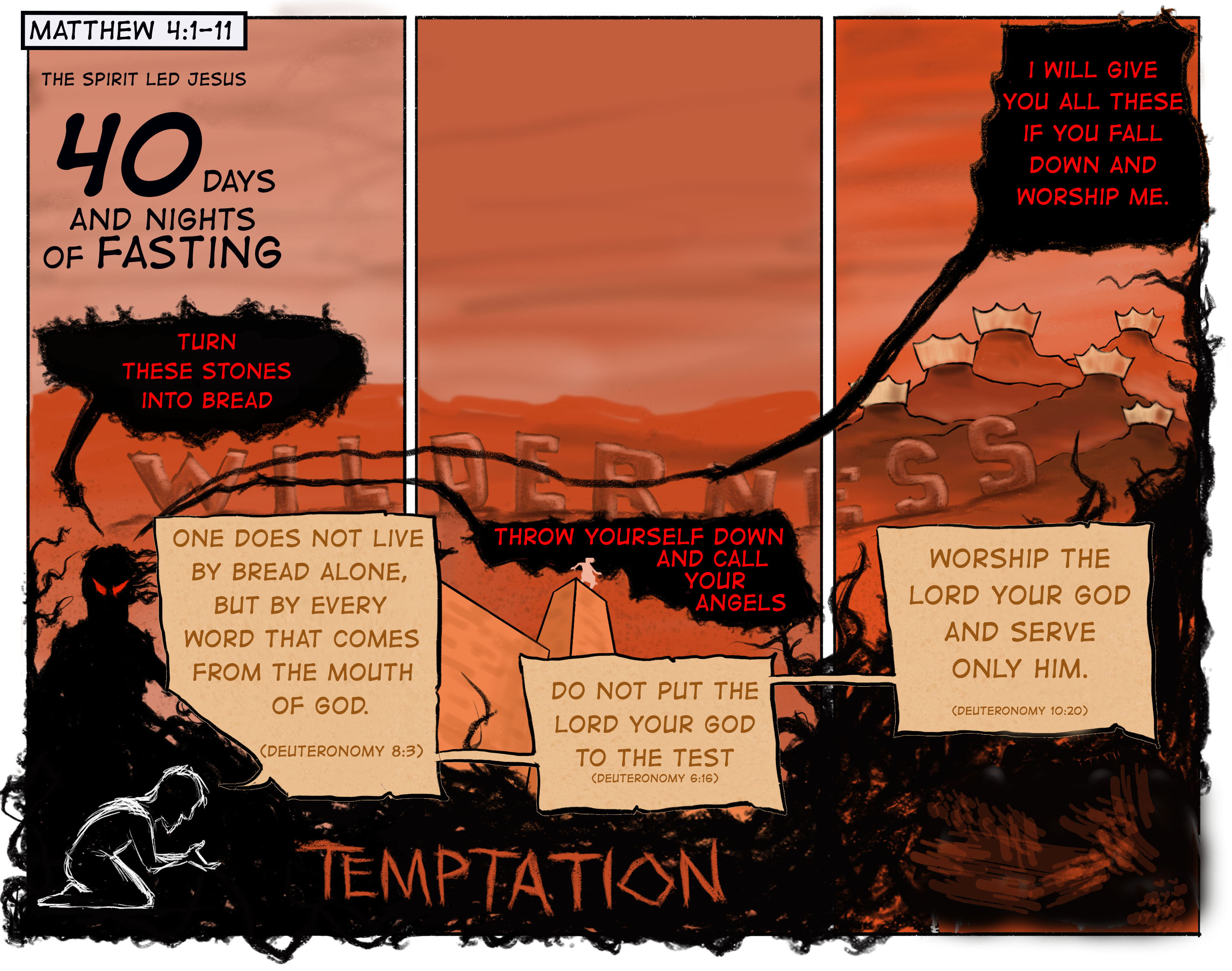 Jesus is tested three times, and, unlike the Israelites, passes each test. He defeats the temptations with scripture and trusts that God will fulfill God’s promises in God’s timing.