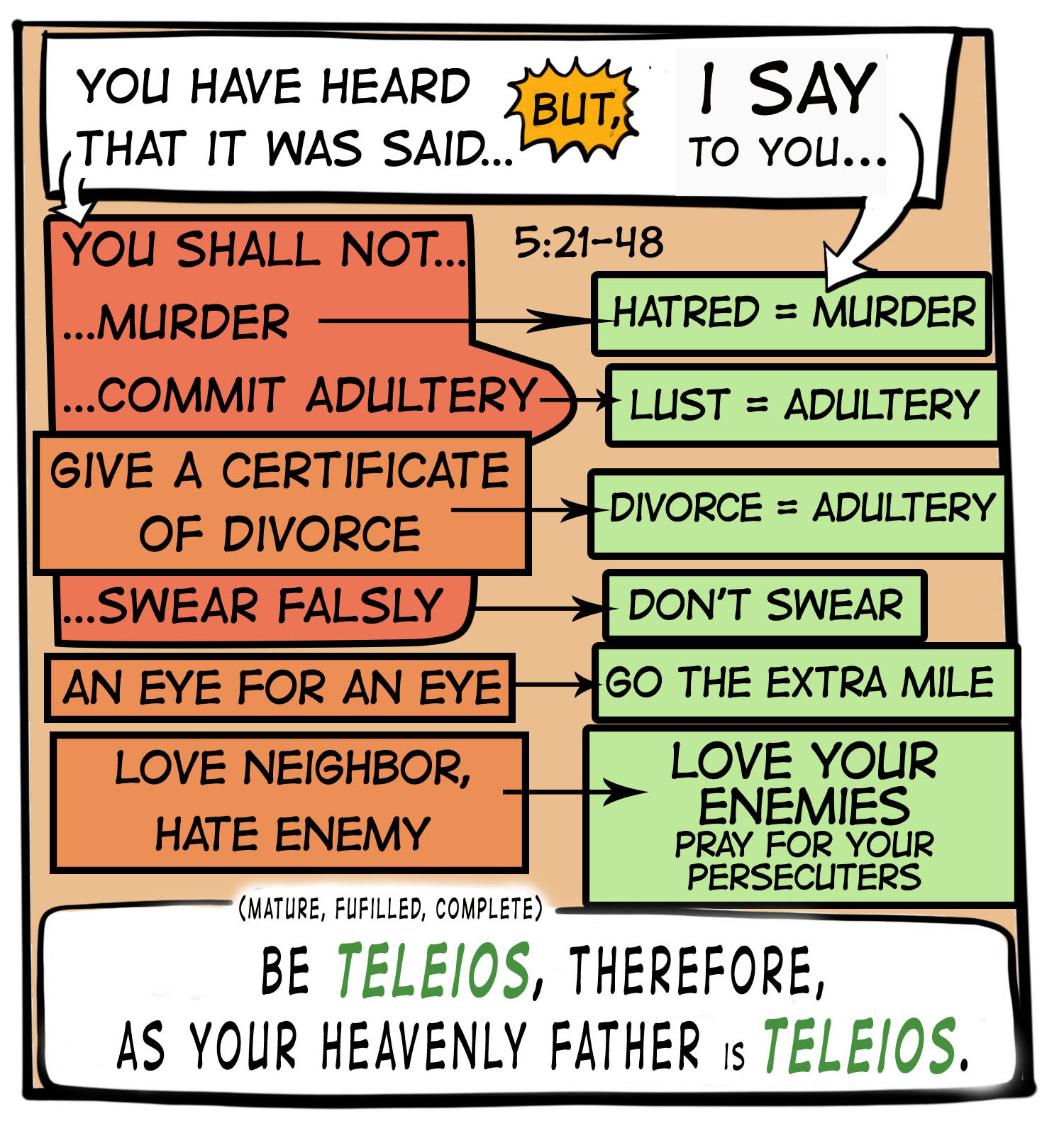 In Matthew 5:17-20, Jesus makes something very clear. He is not inventing something new. He is not trying to throw out the Law of Moses upon which the Jewish culture has been built. Rather, he is trying to remind the people that what he is teaching has always been the purpose of the Law of Moses.