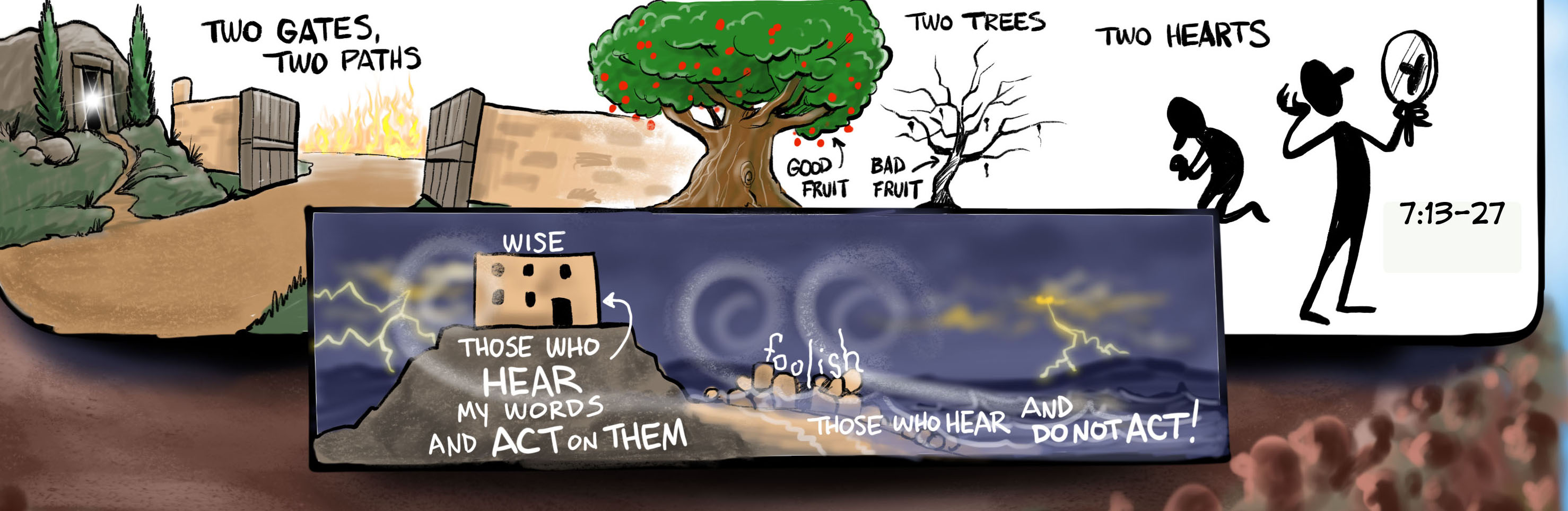 Jesus highlights the importance of his teaching by offering four contrasts in Matthew 7:13-27. Each of these couplets highlights the kind of people whose heart reflects the heart of God and life in the commonwealth of the heavens with those who live for their own kingdom and seek to better themselves over the needs of others.